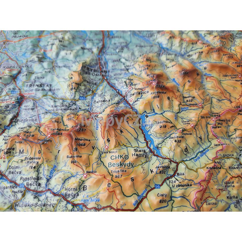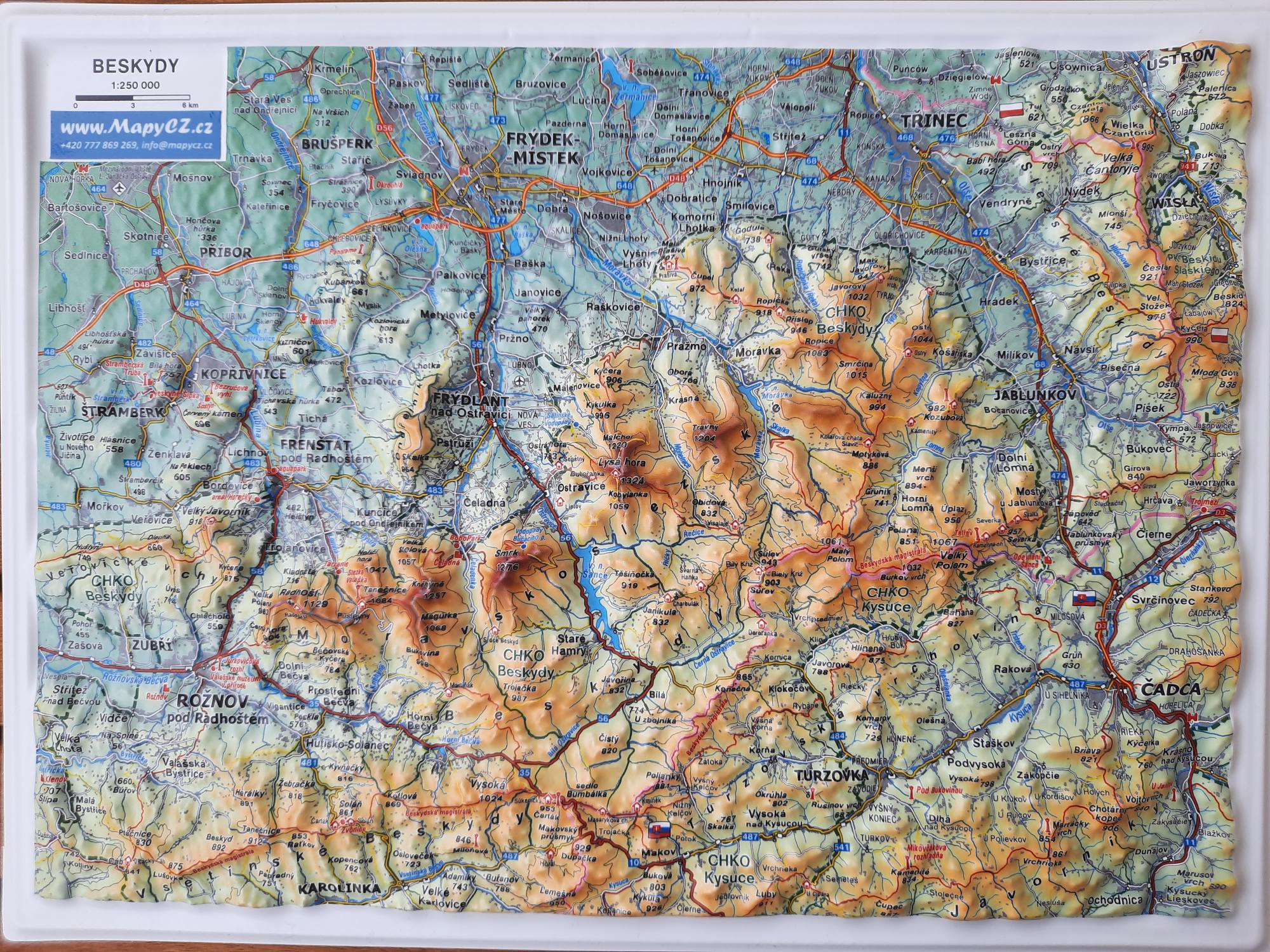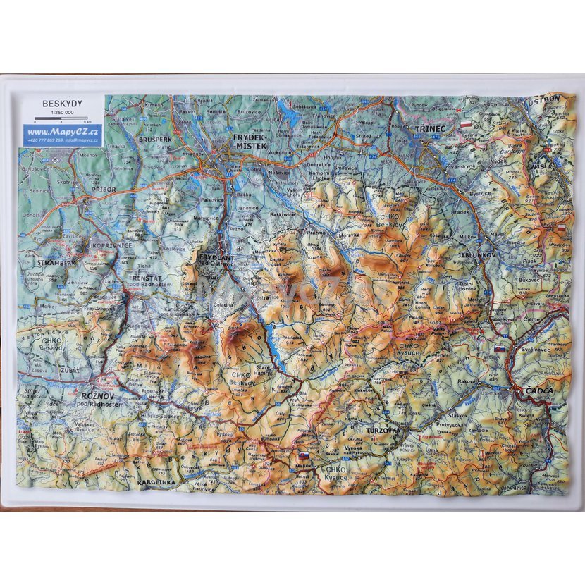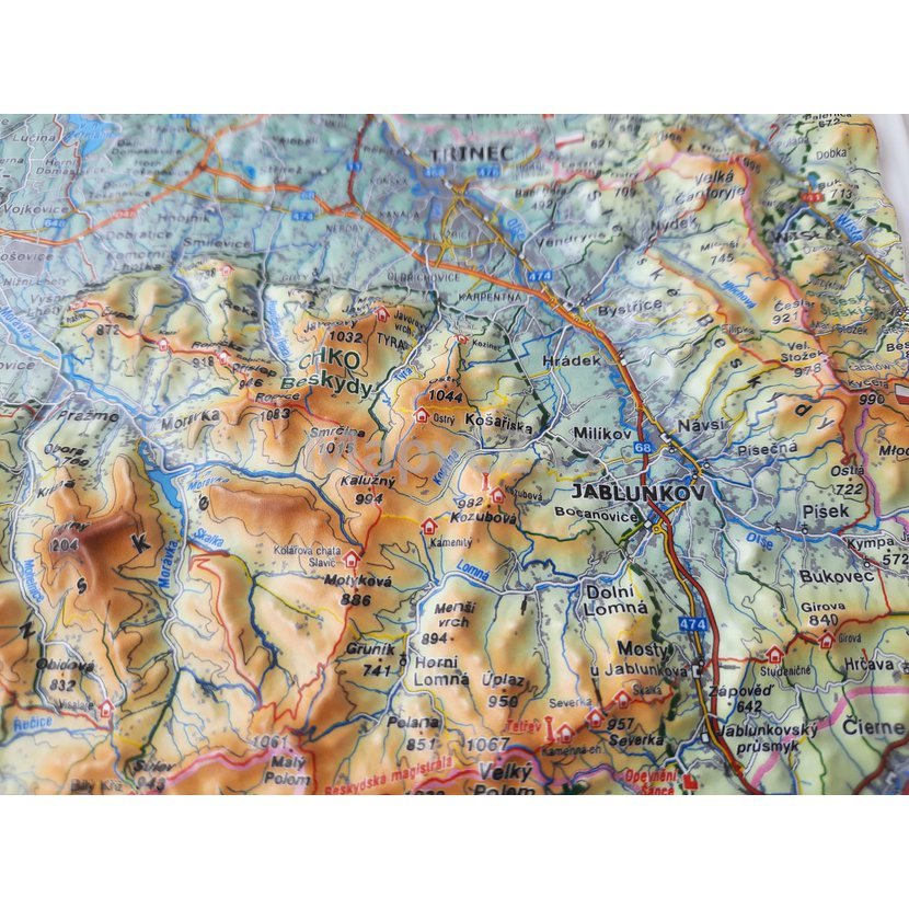 Plastická mapa Beskyd v přehledném příručním formátu. Mapa efektně zobrazuje Moravskoslezské Beskydy, Veřovické vrchy, Vsetínské Beskydy a Javorníky. V mapě jsou popsány pohoří, vrcholky hor, řeky a vodní nádrže, vykresleny turistické stezky, turistické zajímavosti, obce a komunikace. Mapa je tištěná odolnými barvami a lisovaná z plastu.