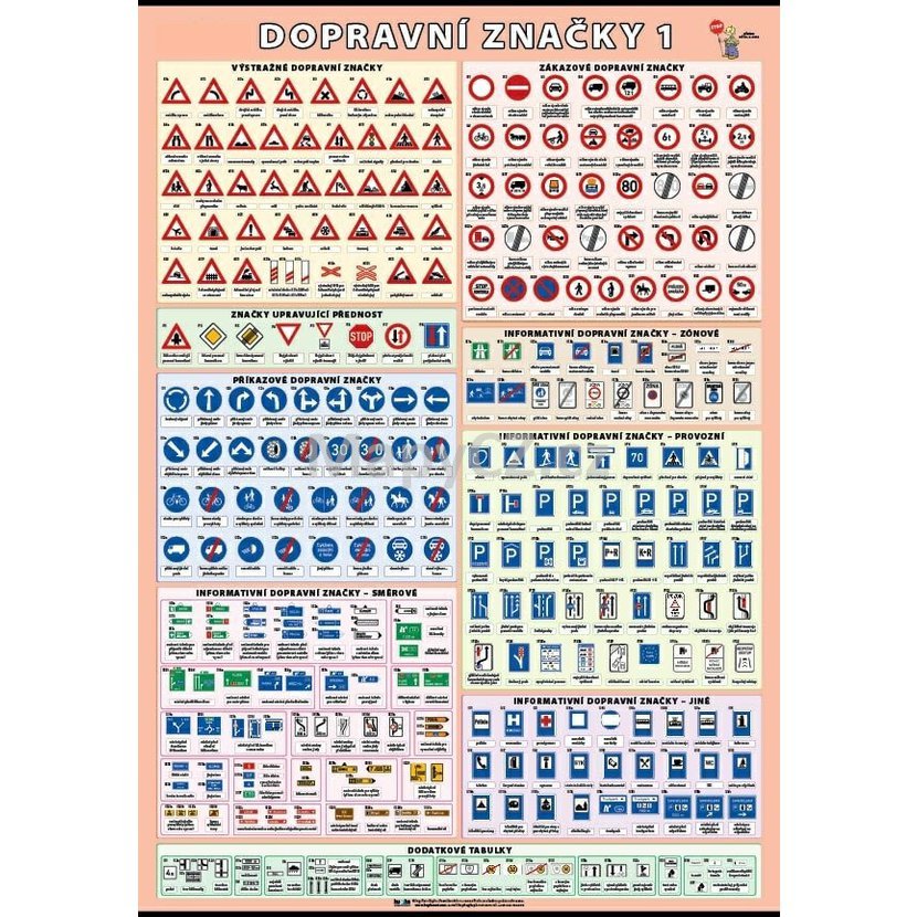 obsahuje všechny svislé dopravní značky: výstražné značky, značky upravující přednost, zákazové značky, příkazové značky, informativní značky (zónové, provozní, směrové, jiné), dodatkové tabulky