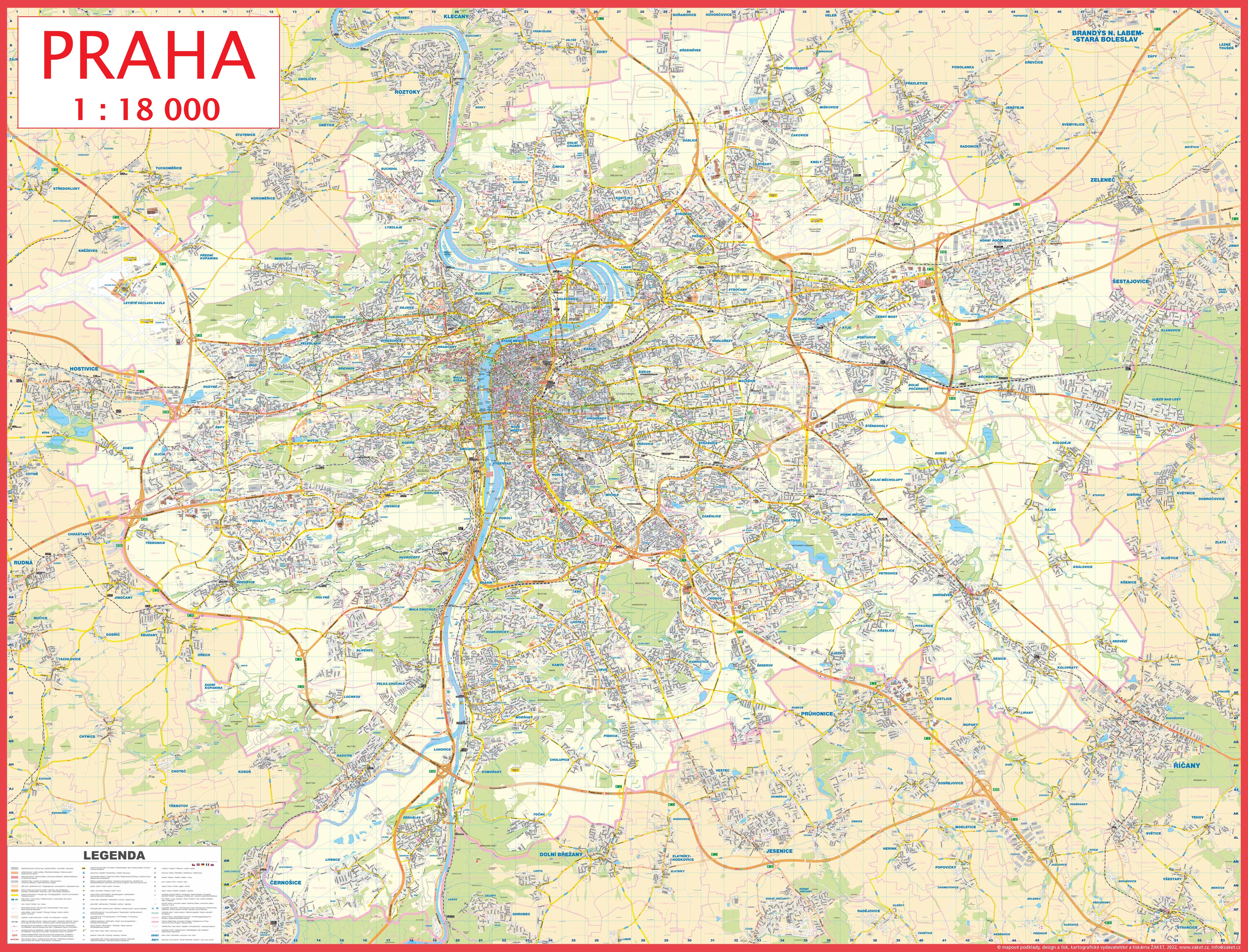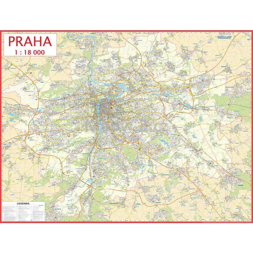 Největší nástěnná mapa Prahy v podrobném měřítku 1:18 000 zobrazuje celé katastrální území Prahy s aktuálním stavem všech ulic a linek městské hromadné dopravy. Rejstřík ulic zašleme v elektronické podobě.